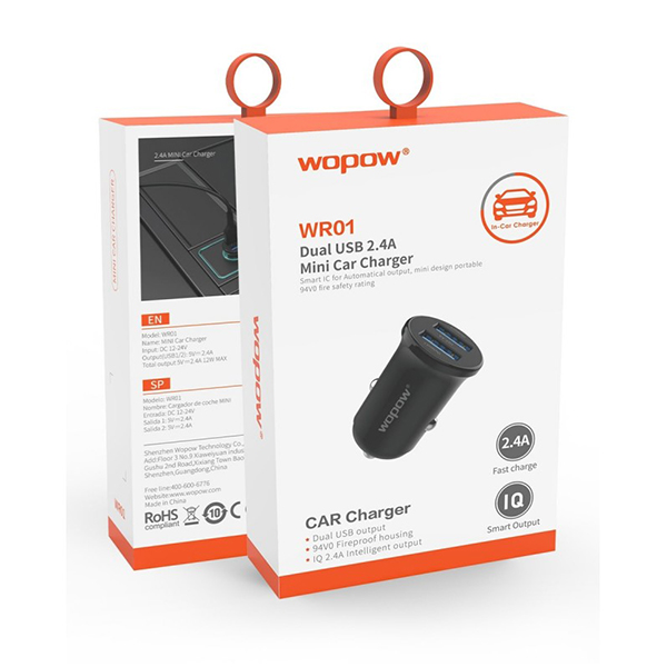 شارژر فندکی وپو WOPOW مدل «WR01 » دارای دو درگاه خروجی USB است.این شارژر فندکی از محصولات شرکت بزرگ WOPOWبوده و ابعاد کوچکی دارد.شدتجریان خروجی هرکدام از این خروجیها 2.4 آمپر است و این مقدار جریان هم گوشیهای موبایل را سریعتر شارژ میکند هم برای شارژ تبلت مناسب است. ولتاژ ورودی این محصول مانند دیگر شارژهای فندکی 12 تا 28 ولت است.این محصول بااتصال به محل فندک خودرو میتواند ولتاژ 5 ولتی را برای شارژ کردن دستگاههایی مثل موبایل، دوربین، GPS و حتی تبلتها فراهم کند.طول شارژر فندکی WOPOW حدود 3.5 سانتیمتر است و همچنین وزن آن فقط 10گرم است.اگر قرار است ساعات زیادی در خودرو به سر ببرید نیاز نیست برای ذخیره شارژ تبلت و گوشی موبایل خود از استفاده از اپلیکیشن های مسیریابی و تماسهای اینترنتی صرفه نظر کنید چون وجود یک شارژر فندکی پرقدرت مانند WR01 که بتواند تبلت ها را هم با هم شارژ کند این مشکل را حل میکند.